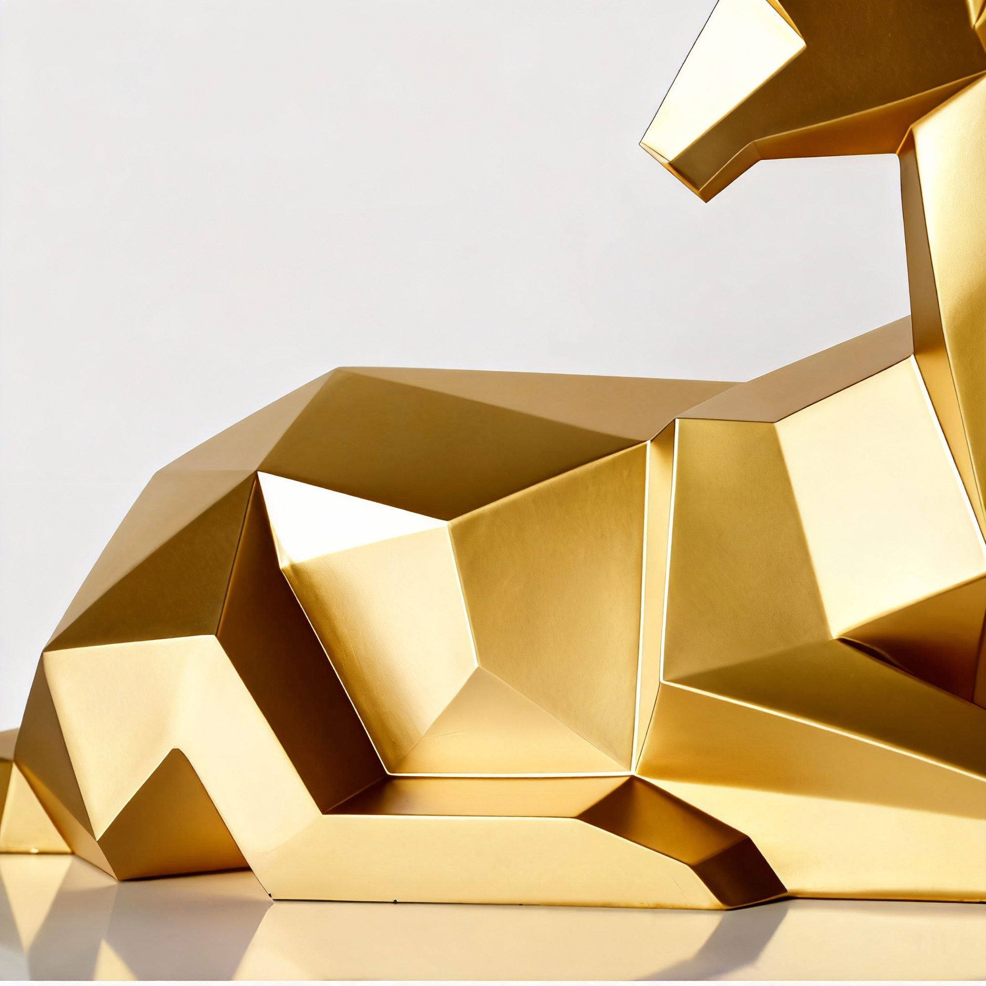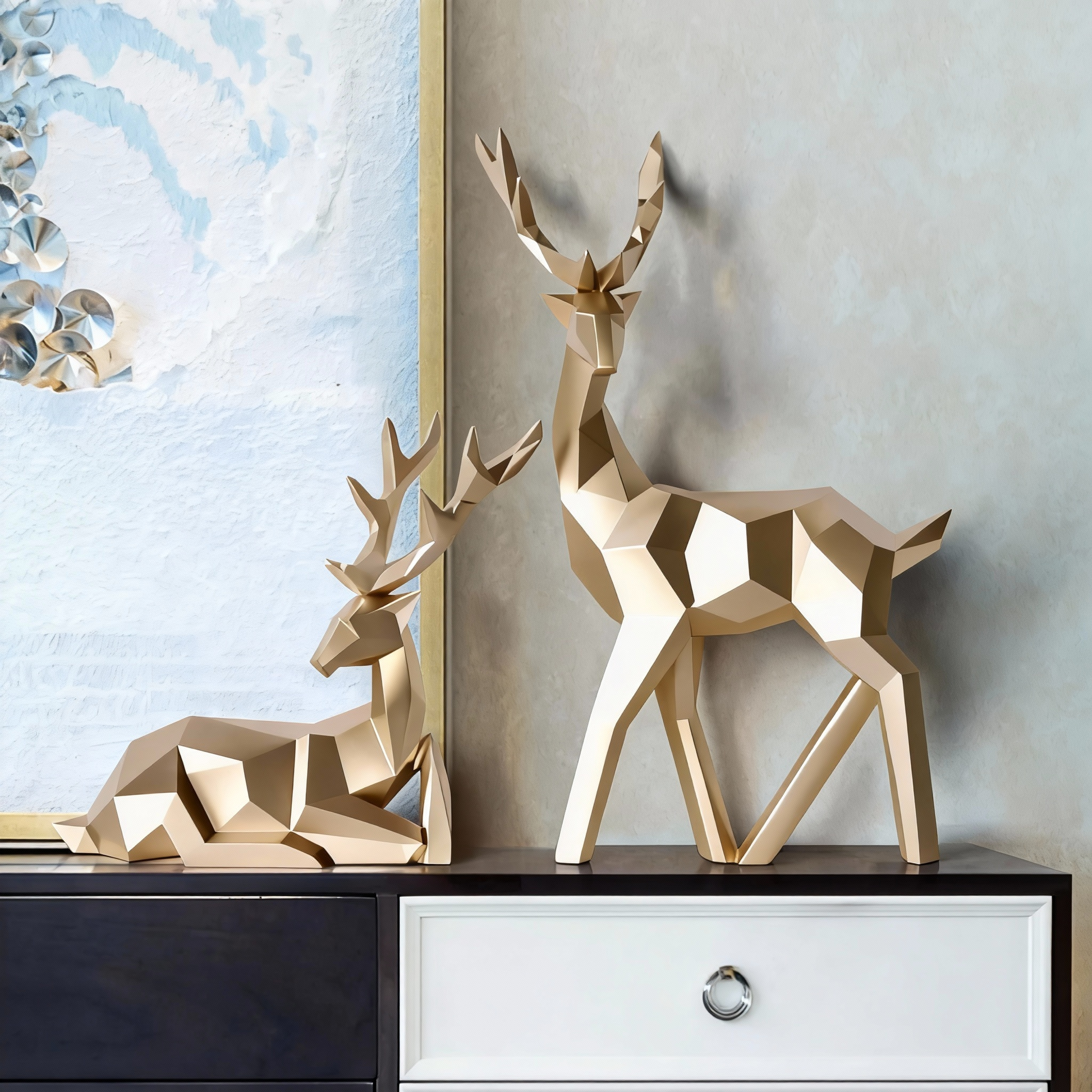 Esta escultura reimagina la majestuosidad del ciervo a través de formas geométricas angulares que crean un efecto visual impactante. El diseño facetado captura la esencia del animal mientras añade una interpretación moderna y artística que fascina desde cualquier ángulo.